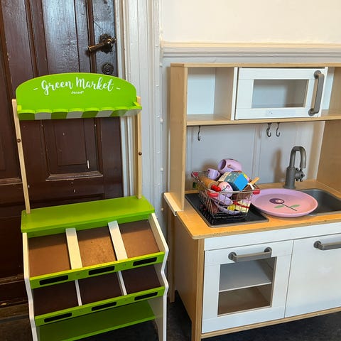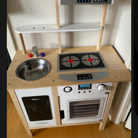 Legekøkken i træ med knapper der kan drejes, vandhane og vask samt komfur.