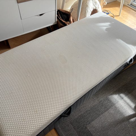 Boksmadras seng med bøjle en. Har stået på kontor som gæsteseng