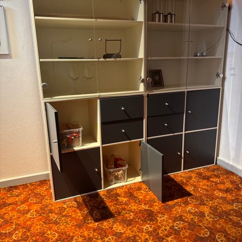 Vitra Wilhelm Lauritzen reolsystem i mørkt træ. Reolen består af flere moduler med både åbne hylder, skabe med låger og skuffer i nederste sektion. Systemet fremstår som en vægfyldende løsning egnet til opbevaring af bøger, service eller andre genstande. Enkelte sektioner har glas og en nedklappelig front, som kan anvendes som lille arbejds- eller serveringsplads. Velegnet til stue, spisestue eller kontor, hvor der er behov for samlet opbevaring og udstilling i ét møbel.