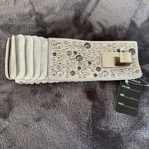 Bælte til kvinde med metalspænde og dekorative nitter med stjernemotiv langs remmen. Bæltet har en lys grundfarve med nitter i forskellige metalliske nuancer. Velegnet til brug i bukser, jeans eller over kjoler for at give et mere markant udtryk. Materialet fremstår som kraftigt og stabilt, hvilket gør bæltet egnet til daglig brug.