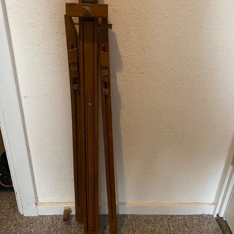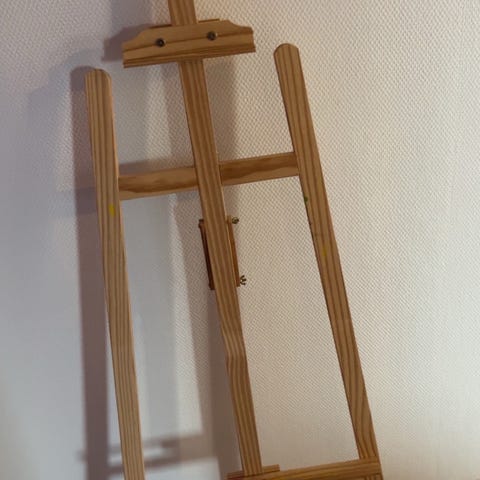 Staffeli i træ som fritstående gulvstaffeli. Staffeliet har justerbar højde til lærredet og en bred hylde til placering af lærred eller maleplade. Max højde på lærred 107cm.