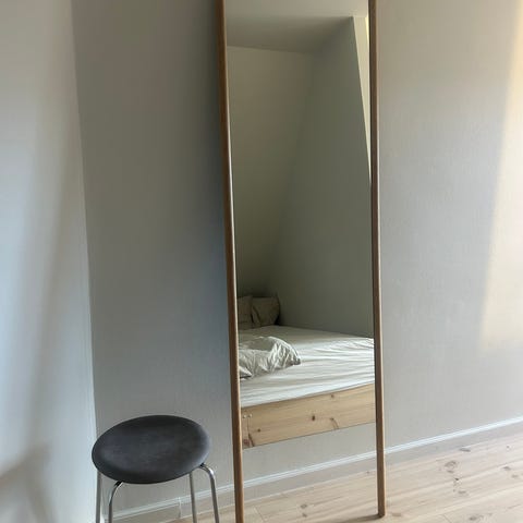 Skagerak spejl med ramme i lyst egetræ. Spejlet har en rektangulær spejlflade og to runde ben/stolper i træ i siderne. Bagsiden er lukket med plade og ophængssnor til montering. Velegnet som vægspejl eller stående spejl i fx entre, soveværelse eller gang.
