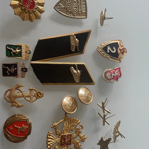 Samling militære emblemer og nåle i metal guldfarve