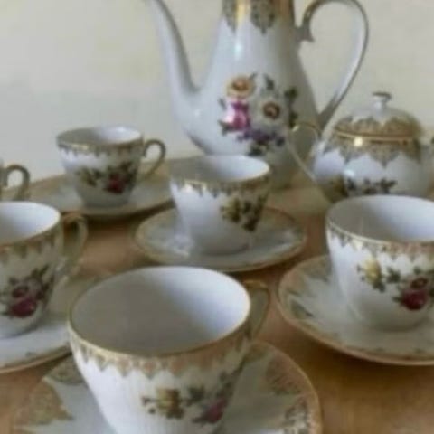 Det er et smukt stel med 2 x 12 par kopper, sukker/fløde sæt og en meget flot kande!
