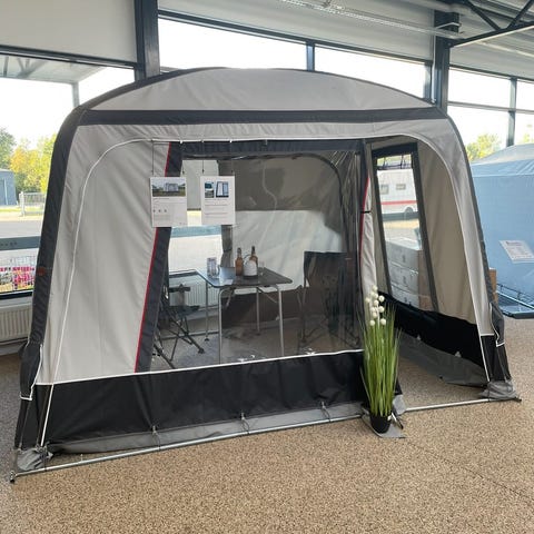Pæn og velholdt fortelt til campingvogn i grå nuancer med store vinduespartier i sider og front. Forteltet har fast tagkonstruktion og lukkede sider, som giver læ og beskyttelse. Egnede anvendelser omfatter campingture og længere ophold på campingplads, hvor der ønskes ekstra opholdsrum foran campingvognen. Velegnet til brug som opholds- og opbevaringsrum i forbindelse med campingvogn.
