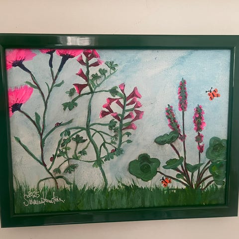 Maleri blomst akryl på lærred med rød ramme