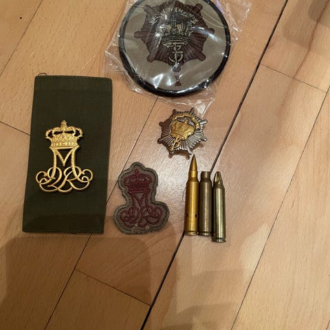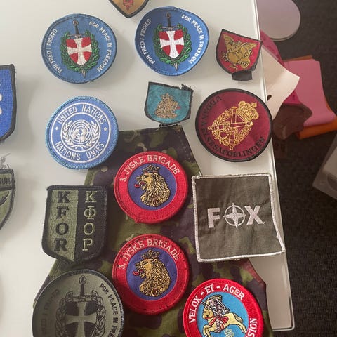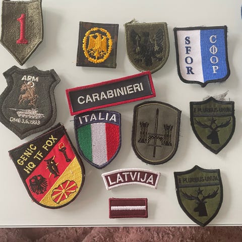 Blandet parti militære stofmærker og emblemer. Forskellige typer skulder- og brystmærker i flere farver og former, herunder røde skjoldformede mærker med våbenskjoldmotiv samt grønne og brune rang- og funktionsmærker. Velegnet til uniformstilbehør, samling eller dekoration. Sælges samlet som vist på billederne.