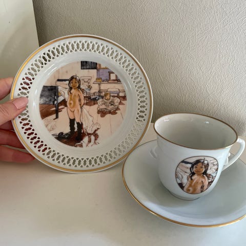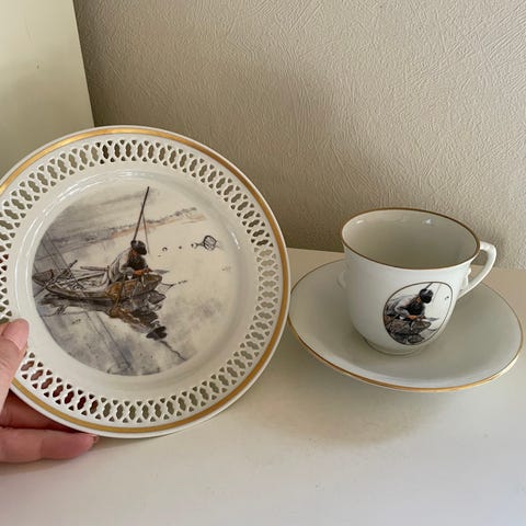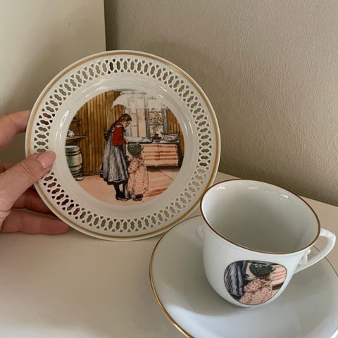 Bing & Grøndahl Carl Larsson ‘Krebsefangst’ kaffekop, underkop og kagetallerken nr. 7. Dia. på kagetallerken 7 cm. Dia. på underkop 13 cm. Højde på kop 7 cm. I fin stand, ingen skår eller afslag, og stort set ingen brugsspor.