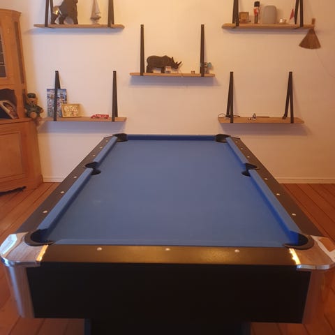 Billardbord med kegler og tilhørende billardkugler. Bordet har grøn dug og klassisk træramme med hjørne- og sidehuller. På bordet er der opstillet kegler til keglebillard. Der medfølger flere billardkøer, som er ophængt på vægophæng. Desuden resultattavle.