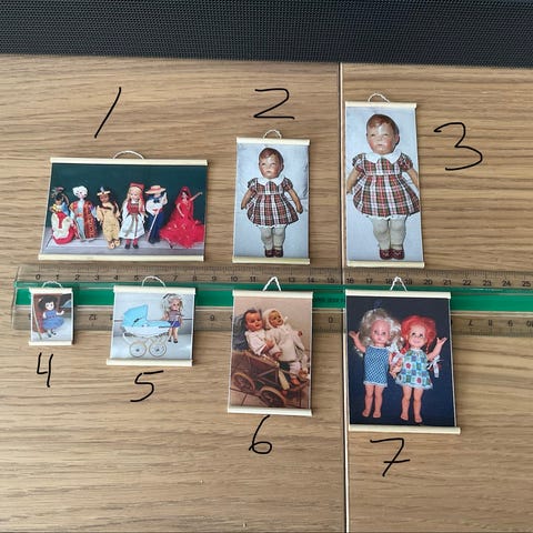 fem små vægplakater med forskellige klassiske reklame-motiver, velegnet som tilbehør til dukkehus bar / billardbord hyggestue eller andre miniaturemiljøer. Skiltene har påmonteret ophæng og kan placeres på vægge i dukkehuset for at give et mere detaljeret og realistisk udtryk. Størrelserne fremgår af billederne med lineal som reference.