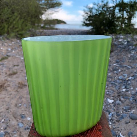 IKEA vase i glas i grøn farve. Vasen har dekoreret, struktureret overflade og står på lille fod. Velegnet til blomster eller som dekorativt element i hjemmet.This vintage green Carnival glass item is a Fenton "Orange Tree" hatpin holder, which was manufactured around the 1910s.