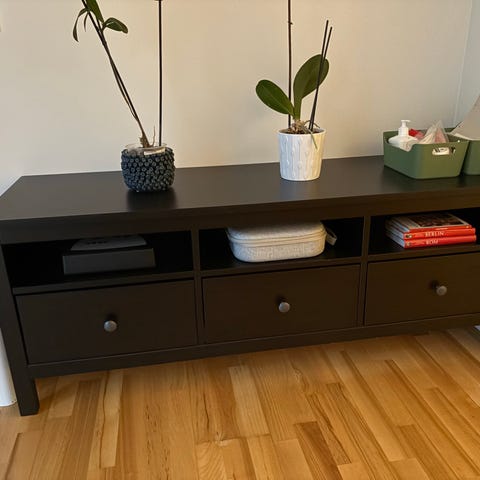 Fint hvidt TV bord fra IKEA sælges. Mener det er en gammel udgået Hemnes model. Få brugsspor på toppen ind mod væggen, men ses ikke særlig tydeligt. Trænger til en klud da det har stået til opbevaring.