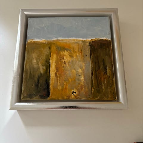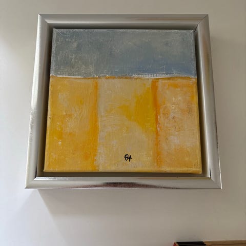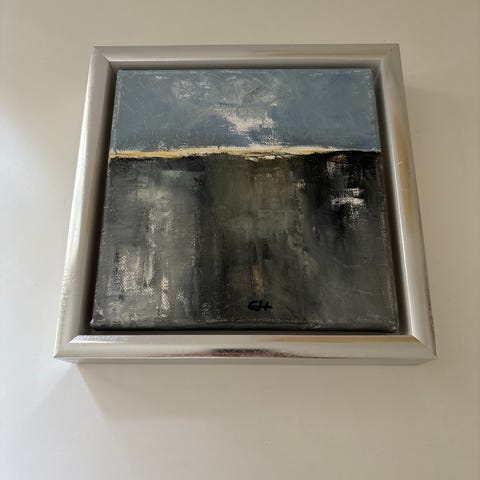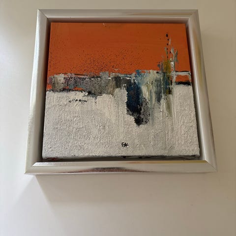 Erik Hansen abstrakt maleri med ramme i kvadratisk format. Motivet er holdt i rød og hvid med mørke, abstrakte penselstrøg i midten. Maleriet er signeret "CH" på forsiden. Det leveres indrammet i en dyb, lys ramme med ophæng på bagsiden, klar til at sætte direkte på væggen. Velegnet som vægdekoration i stue, kontor eller andre opholdsrum. Måler ca. 25x25cm