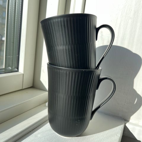 Royal Copenhagen krus i sort riflet. Krusene har hank og er velegnede til varme drikke som kaffe, te eller kakao. Designet er enkelt med mat yderside og glans inderside. Brugt 1-2 gange så står som helt nye. Sælges i par eller 4 stk.