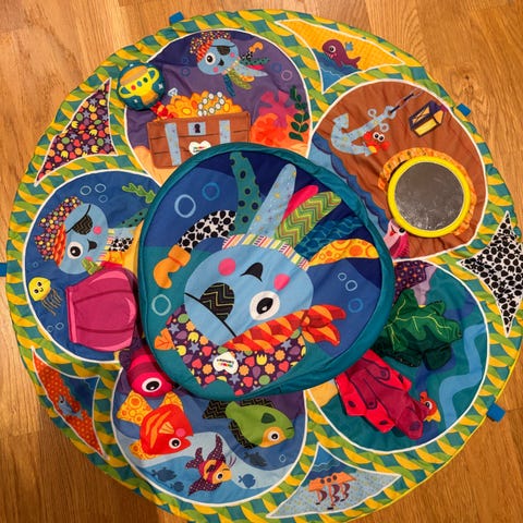 Kaptajnen i midten har en ekstra vatteret pude og tæppet rundt om kan drejes rundt, så baby kan ligge i midten og opleve alle de forskellige aktiviteter.