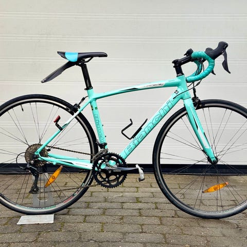 Team Rynkeby Bianchi racercykel til kvinder i størrelse S med 28"/700c hjul. Cyklen har let stel med klassisk racerstyr og smalle dæk, velegnet til landevejskørsel og træning. Farven er gul med sorte detaljer. Udstyret omfatter blandt andet sadeltaske under sadlen. Cyklen er egnet til kvinde i den mindre til mellem højde, afhængigt af personens mål og kørestil. Stort set ubrugt. Nypris ca. 18.000 kr.