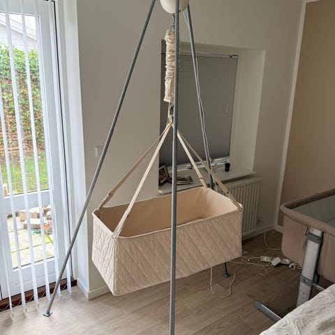 Sælger vores Moonboon vugge med motor og stativ – en stilfuld, tryg og praktisk løsning til babyens søvn. Kun brugt til ét barn og fremstår i meget flot og velholdt stand.