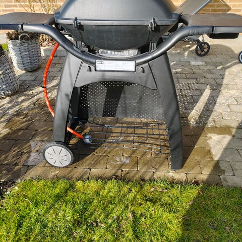Weber Q 3200 meget fin rist og brænder. Der følger en 10 kg gasflaske ca, halv fuld og cover med. Der er en revne i cover. Se billede.