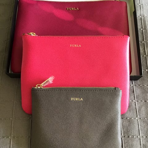 Furla, 2 stk FURLA Babylon envelope i purple red med hank 25x19 cm ( Pris: 399,-) og den lille i pink begge i læder 20x15 cm ( Pris: 199,-)
