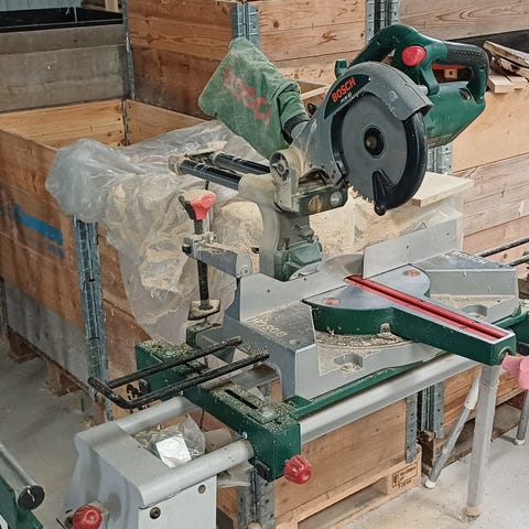 Parkside kap-/geringssav med stativ. Saven er monteret på et foldbart arbejdsstativ med lange støttearme til længere emner. Maskinen er velegnet til præcise kap- og geringssnit i træ og lignende materialer. Justerbar vinkel og dybde giver mulighed for forskellige snitindstillinger. Egnet til både værksted og byggeplads, hvor der er behov for faste og gentagne snit i lister, brædder og andre træemner.