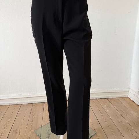 Dorothee Schumacher bukser til kvinder i str. S. Bukserne er i brun, sort mønstret viskose og acetat med smalle ben, høj talje lille slids foran. Skrå forlommer, skjulte baglommer og bæltestropper. Str 2 som svarer til dansk str 36.