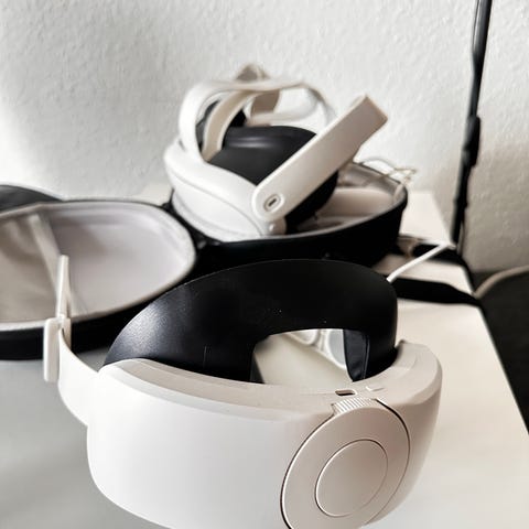 Meta Quest 3 VR-headset i hvid med 512 GB intern lagerkapacitet. Headsettet leveres med justerbar rem og polstrede ørepuder omkring linserne. Sættet inkluderer to trådløse controllere i matchende farve med knapper og styrepinde til navigation og interaktion i VR-miljøer. Velegnet til brug med kompatible VR-spil og -applikationer, hvor der ønskes trådløs og selvstændig VR-oplevelse uden behov for ekstern sensoropsætning.