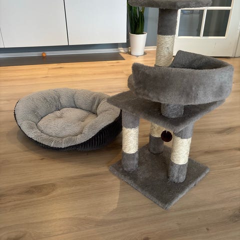 Klatretræ til kat i beige farve. Modellen har en lukket hule i bunden med åbning foran samt flere ligge- og udsigtsplatforme i forskellige højder. Der er en rund liggeskål i siden og flere stolper, som katten kan bruge til at klatre og hvæsse kløer på. Velegnet som kombineret sove-, lege- og klatreområde til én eller flere katte.