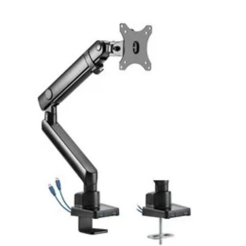 Gas Spring Monitor Arm skærmholder i sort. Egnet til montering af en computerskærm på bordkant eller lignende overflade. Armen er gasfjederbaseret, hvilket giver mulighed for justering af højde og vinkel på skærmen. Leveres med monteringsbeslag som vist på billedet og er beregnet til brug med kompatible skærme inden for det angivne vægt- og størrelsesområde på emballagen. Inkl skærmen.