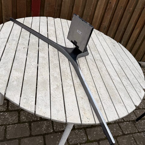 Samsung tv fod / stander i sort plast og metal. Foden er beregnet til montering på bagsiden af et Samsung tv og har flere skruehuller til fastgørelse. Egnet som reserve- eller udskiftningsfod til kompatible Samsung tv-modeller, hvor original fod mangler eller er defekt. Farve: sort. Materiale: plast med metalplade til montering.