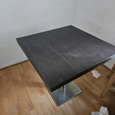 Lille kvadratisk bord med 2 polstrede stole, træ og lys stof