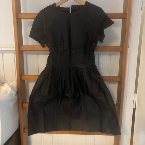 Lækker skater-kjole i PU-materiale (kunstig læder). Korte ærmer og kort længde - sidder tæt i taljen og på overkroppen og er mega klædelig. Str. 38. Trænger til at blive afkrøllet efter et par år på loftet, men er ellers i super stand.