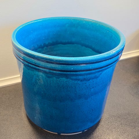 Kähler keramik krukker i blå glasur. Sættet består af tre urtepotteskjulere i samme stil.