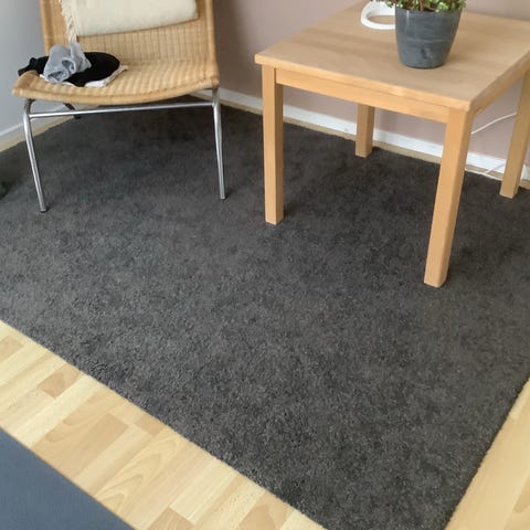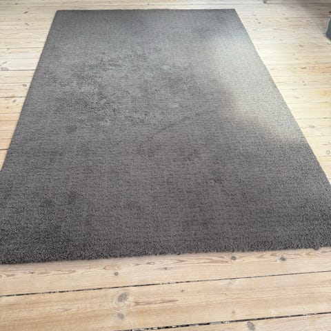 IKEA Tyvelse tæppe i grå nuance. Rektangulært tæppe, egnet til brug i stue eller andre opholdsrum. Blødt, tæt luv, som giver en dæmpende og behagelig overflade at gå på. Neutralt design, der passer ind i mange indretningsstile. Materiale og præcise mål fremgår af etiketten på tæppet (Tyvelse-model). Velegnet som gulvtæppe under sofa- eller spiseområde.