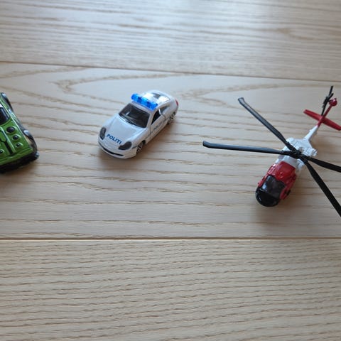 Lastbiler er ca 48 cm lang og helicopteren med manuelt roterende propel er ca 25 cm lang. Flot stand. Fungerer som det skal.