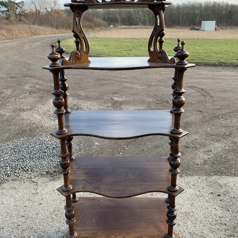 Træ etagere med 3 hylder i ternet finer. Møblet har tre buede hylder med kvadratiske felter i fineret træ og drejede stolper mellem hver hylde. Nederst er der ben med dekorative kugleformede afslutninger. Etagèren kan anvendes som sidebord eller opbevaringsmøbel til f.eks. dekorationer, bøger eller småting i stue eller entré.