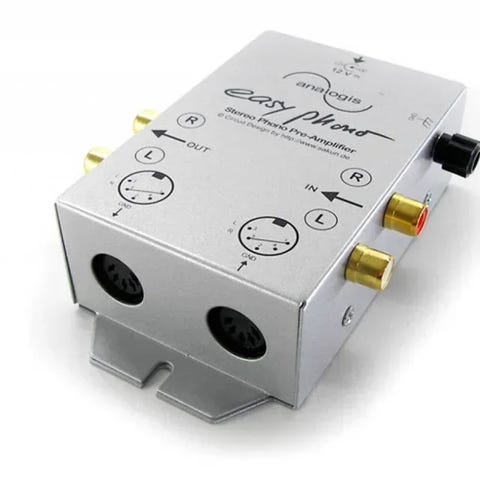Denne enhed tillader tilslutning til et stereoanlæg med en pladespiller med magnetisk pickup uden at tilslutte en særlig phono-indgang. Forforstærkeren sikrer optimal Niveaujustering og equalisering af musiksignalerne, der er til stede på pladen. Enheden har RCA- og DIN-forbindelser for alle gældende stikstandarder. Også for historiske, tre-pins DIN-stik! Hvis den er forbundet til en pladespiller med RCA stik og ekstra jordledning til en summende lyd, luk venligst Jordkabel til jord-/jordskruen på Easy-Phono mærket "GND".