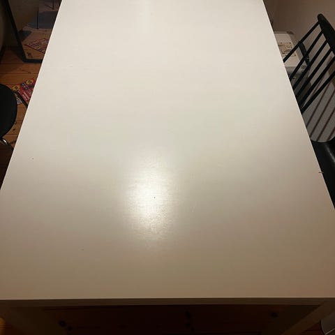 Udslået 170x90 cm, men når flapperne er under så 90 x 90. Er brugt af børn til at tegne og male ved. Så enkelte pletter som nok kan fjernes med sprit og knofedt.