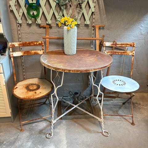 Retro havebord og havestole i træ og metal. Sættet består af et rektangulært bord med lameller i træ og stel i metal samt 6 matchende havestole med armlæn. Stolene er stabelbare, hvilket gør dem nemme at opbevare. Træet fremstår patineret og egner sig til udendørs brug på terrasse, altan eller i haven.