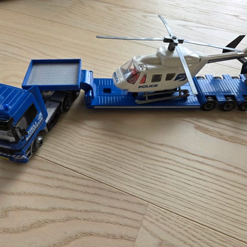 Porsche 996 politibil og grøn racerbil, begge 2 biler er ca 7 cm lang og fra mærket Majorette. Helicopteren har manuelt roterende propel og er ca 12 cm lang.