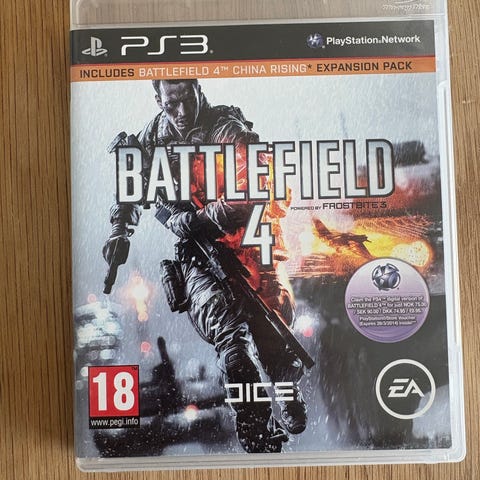 EA Battlefield 4 Playstation 3 spil. Fysisk udgave i plastcover til PS3-konsol. Spillet er et førstepersonsskydespil med både singleplayer- og multiplayerdel. PEGI 18-mærket. På omslaget fremgår udgiver EA og udvikler DICE samt standard PS3- og Blu-ray-mærkning. Velegnet til brug på Playstation 3-systemer, der understøtter PS3-spil på Blu-ray-diske.