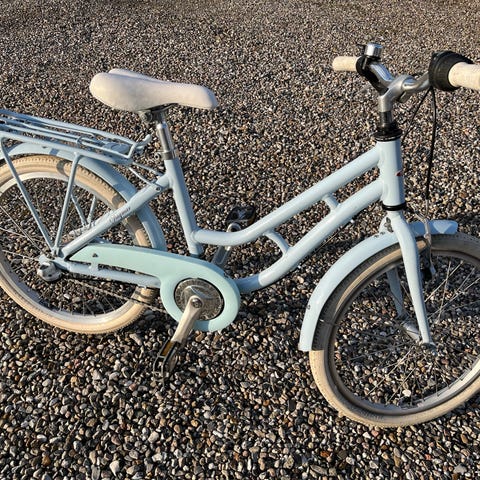 Børnecykel med 20" hjul i pink farve. Cyklen har lav indstigning, kurv foran og bagagebærer bagpå. Udstyret med kædeskærm, støtteben og håndbremse foran. Egnet til børn, der passer en cykel med 20" hjulstørrelse.