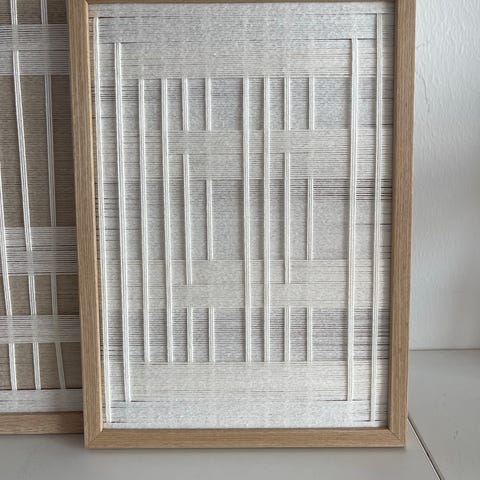 Kvadratisk billede med grafisk mønster til væg. Motivet består af felter med lodrette og vandrette striber i beige og hvid. Billedet er indrammet i en tynd, mørk ramme. Måler ca. 90 x 90 cm udvendigt. Velegnet som enkel, dekorativ vægkunst i stue, soveværelse eller kontor.