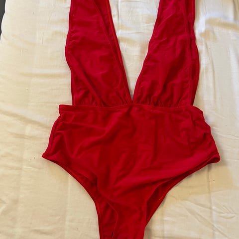 Shein badedragt til kvinder i str. L. Badedragten er rød og fremstillet i polyester. Modellen har dyb udskæring foran og snøre-/korsage-detalje på ryggen, som kan justeres for bedre pasform. Velegnet som almindelig badedragt til strand og pool.