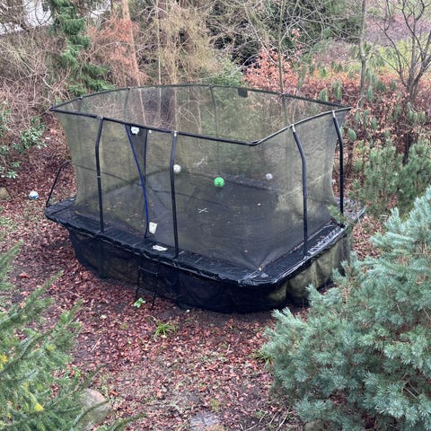 Måler 2,44 x 3,96 M. Den er gravet ned i sommeren 2023, og har aldrig været hoppet på med fodtøj, og er derfor rigtig flot. Der kan medfølge et helt nyt sikkerhedsnet, som vi aldrig har brugt.