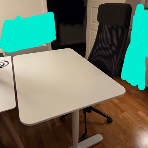 IKEA Bekant skrivebord på 140 x 60 cm med manuel hæve sænke. Sort rektangulær finéret bordplade med afrundede hjørner. Sort stel der kan indstilles manuelt i højden fra 65-85 cm. Kabelstyringsnettet under bordet samler alle kabler fra computer og skærme.