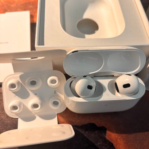 Apple AirPods Pro trådløse in‑ear høretelefoner i hvid. Modellen leveres med MagSafe‑ladeetui, udskiftelige silikonepropper i flere størrelser og Lightning‑til‑USB‑C‑kabel til opladning. Høretelefonerne er designet som true wireless in‑ear med aktiv støjreduktion og transparenstilstand (ifølge modelserien). De kan bruges til musik, opkald og anden lydafspilning og er kompatible med Apple‑enheder, der understøtter Bluetooth og iOS/macOS funktioner til AirPods Pro. Pakken indeholder høretelefoner, ladeetui, opladerkabel og dokumentation, som vist på billederne.