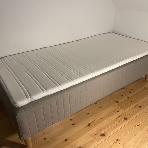 90x200 IKEA Skårer boxmadras i grå betræk med træben. I rigtig pæn stand. Topmadras gives væk da der er nogle pletter af spildt te på den. Røgfrit og dyrefrit hjem.