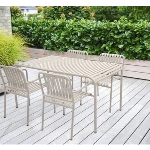 Havebord med 6 matchende stole i metal i lyseblå farve. Rektangulært bord med lameller i bordpladen og rørstel. Stolene har armløse sæder og ryglæn med lameller, der matcher bordets design. Sættet er egnet til udendørs brug på terrasse, altan eller i haven.