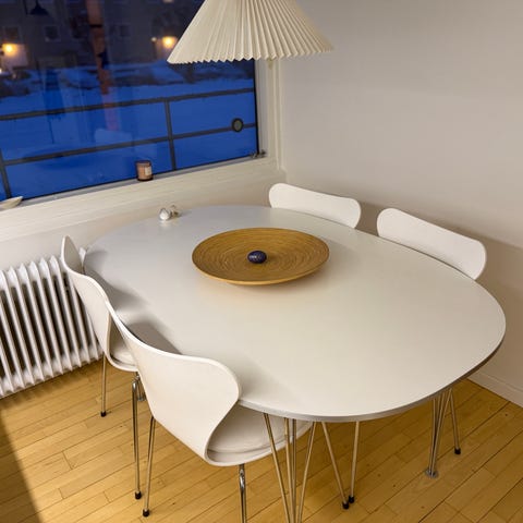 Smukt og klassisk Superellipsebord fra Fritz Hansen sælges.Modellen er B611 (90×135 cm) med hvid laminatbordplade og kromben – et tidløst designikon, der passer perfekt i både moderne og klassiske hjem.