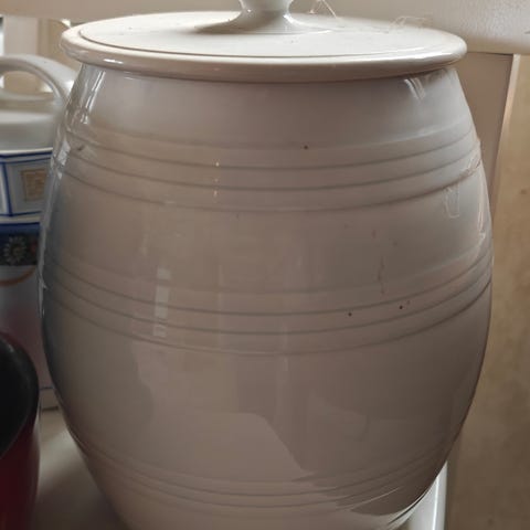 Porcelænskrukke med låg i hvid med flerfarvet blomstermotiv på siden og på låget. Krukken har svungne sider og står på en lille fod. Egnet til opbevaring i køkken eller som dekorativ genstand i hjemmet.